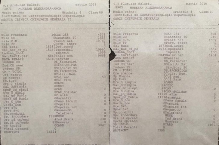 Anca Mureșan este medic primar chirurg la Institutul Regional de Gastro-enterologie „Octavian Fodor” din Cluj-Napoca si si-a publicat fluturasul de salariu pe Facebook, pentru a demonstra tuturor ca salariile medicilor au crescut substantial in ultima luna: castiga 11.200 de lei, aproape dublu, cu tot cu o garda suplimentara intr-o zi de sambata.