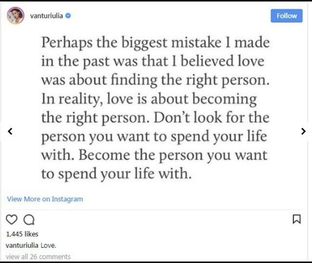 Traducerea mesajului postat de Iulia Vantur: „Poate cea mai mare greseala pe care am facut-o in trecut a fost faptul ca am crezut ca iubirea insemna sa gasesti persoana potrivita pentru tine. Nu cauta persoana cu care vrei sa-ti petreci viata. Trebuie sa devii persoana cu care vrei sa-ti petreci viata.”