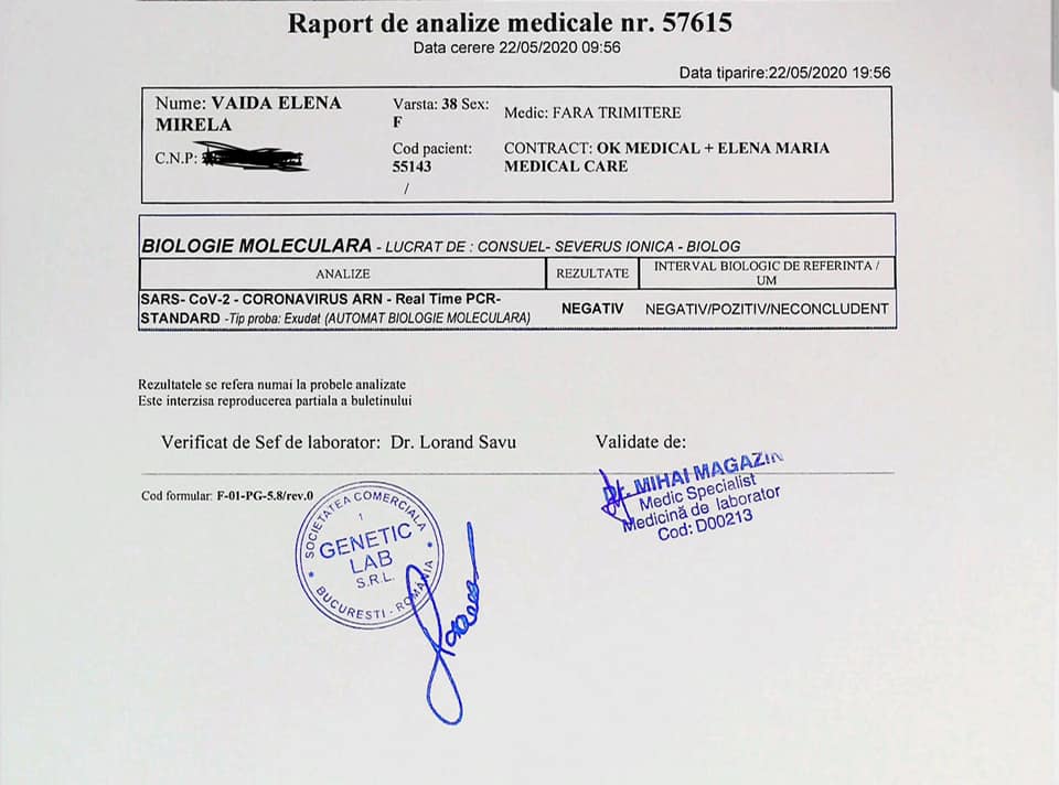 „Nu am coborât din mașină, nu am atins nimic și pe nimeni, am coborât geamul portierei cât să mi se poată preleva probele din gât și asta a fost tot! A durat 3 minute cu totul și, in mai puțin de 24 de ore, aveam rezultatul pe mail! E adevărat, am așteptat rezultatul cu emoții! Dar trebuia să știu!”, a fost o parte din mesajul Mirelei Vaida.